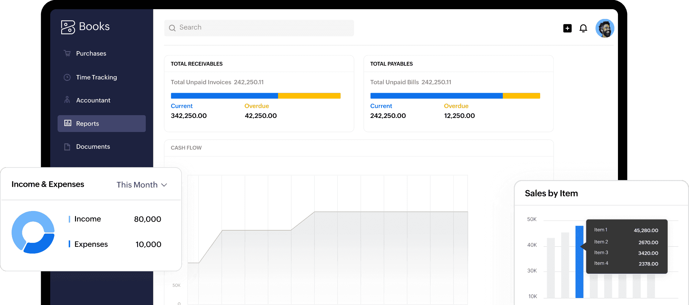 See your business performance at a glance. The Zoho Books dashboard provides a quick snapshot of your financial health, including cash flow, payables, receivables, tax liabilities, and more.